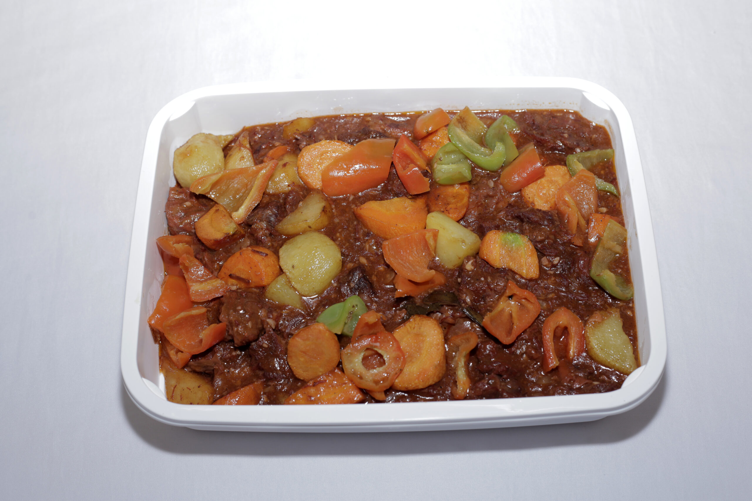 A hearty Filipino beef stew cooked with tomato sauce, liver spread, and vegetables, known for its rich and savory flavor. Often served during gatherings and special occasions.