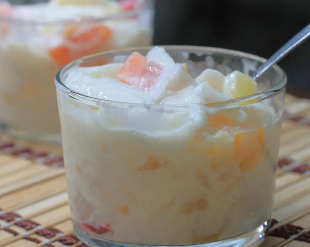 - Add fruit cocktail, nata de coco, kaong, and buko strips into the dressing.